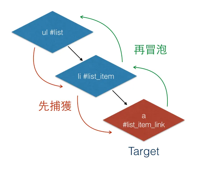 为什么会有 “传输顺序” 这一词呢?假设你有一个 ul 元素,底下有很多 li,代表不同的 item。当你点击任何一个 li 的时候,其实你也点击了 ul,因为 ul 把所有的 li 都包含了。