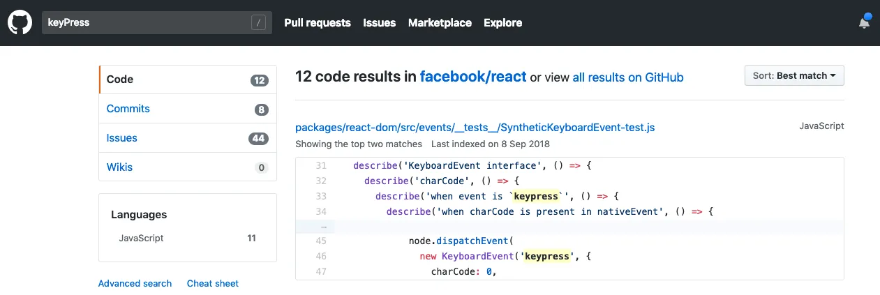 这边我们用 keyPress 来当关键字,出现了 12 笔结果: